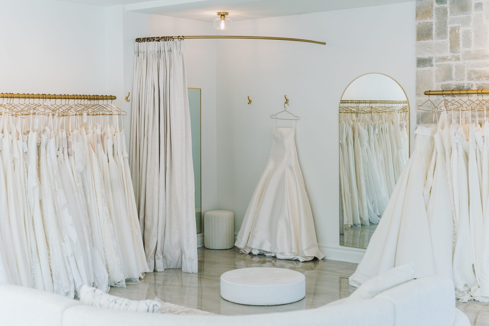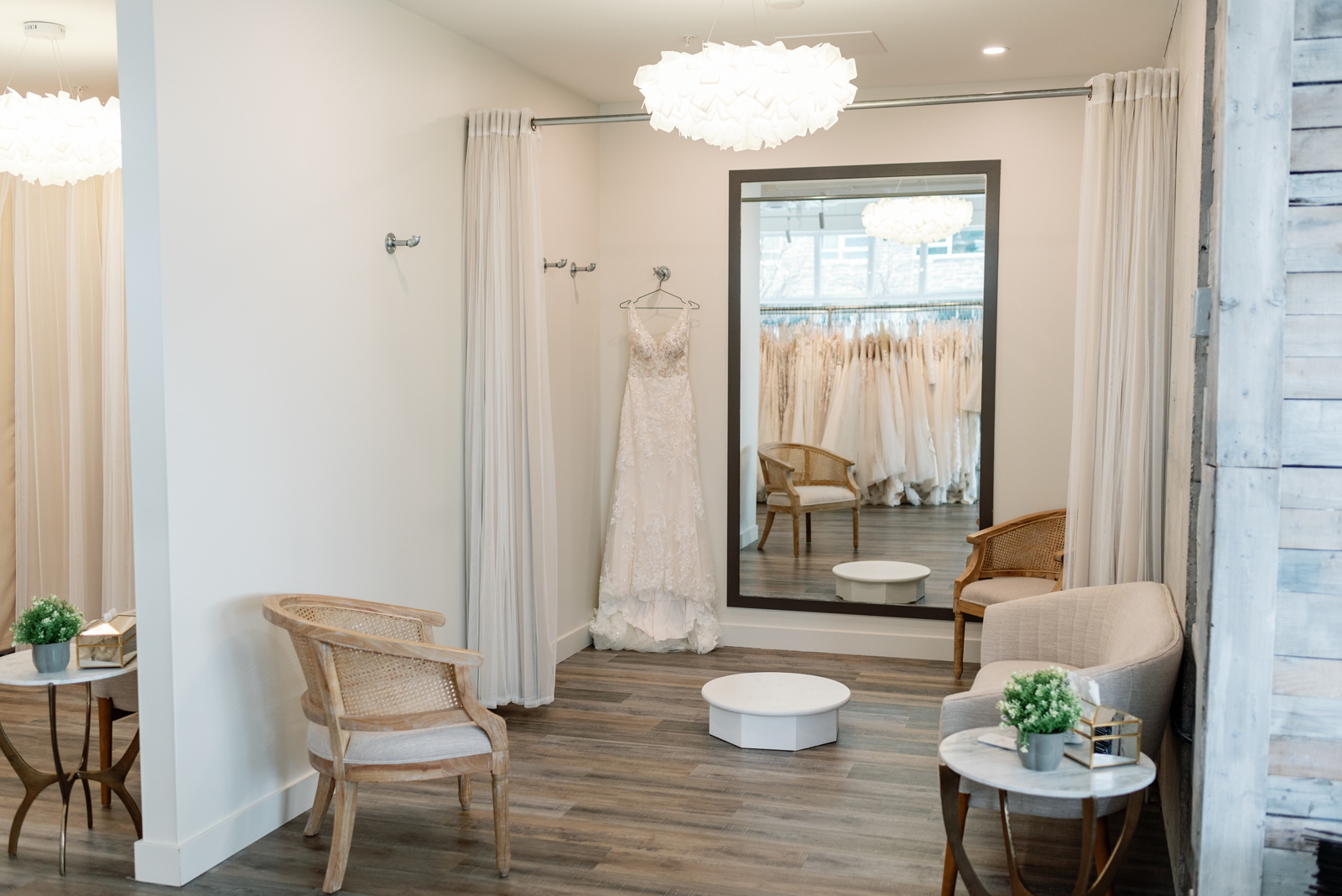 As soon as you walk in to Chester & Felicity, you’ll see so many beautiful dresses at every turn. There are so many options to choose from, with every style, shape, and size imaginable. Chester & Felicity has 3 gorgeous fitting rooms and plenty of seating for your entourage to wait for you to be revealed in your dream dress!